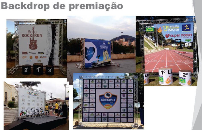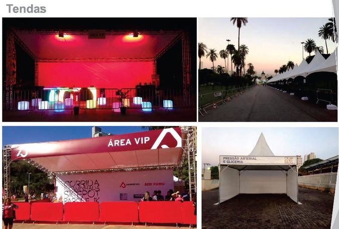 Aluguel de estruturas físicas, como relógios (cronômetro) de led, Barracas 3X3 metros, equipamentos de áudio, Painel de LED de alta definição e outros;